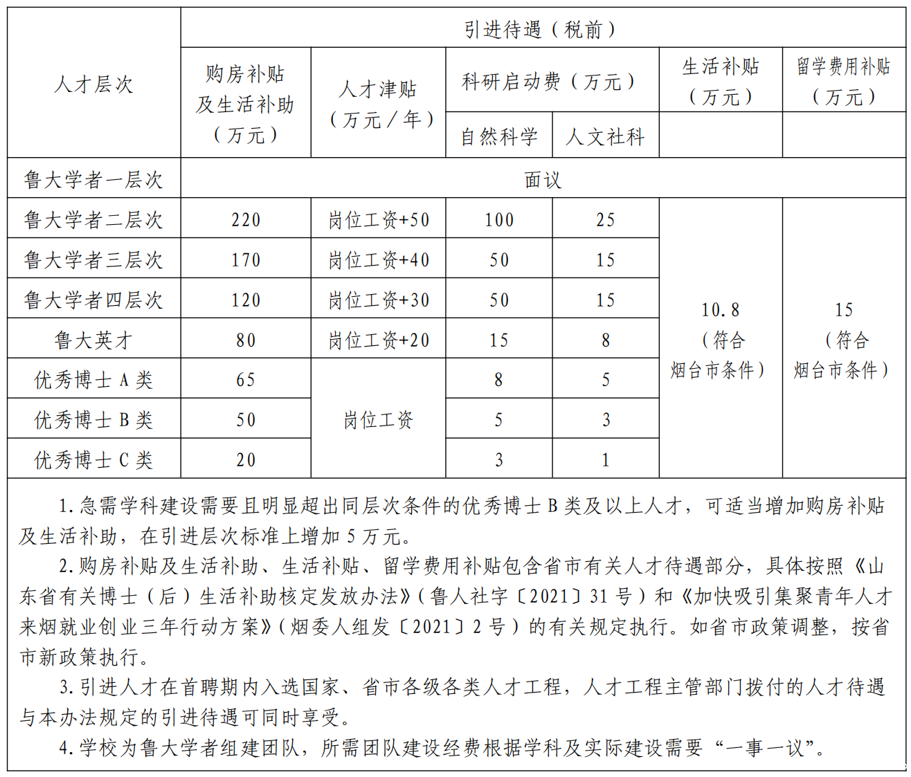 引进人才层次分为鲁大学者、鲁大英才、优秀博士三个类别。其中鲁大学者分为四个层次,鲁大学者一层次、鲁大学者二层次、鲁大学者三层次、鲁大学者四层次。优秀博士分为三个层次,具体划分方式如下。