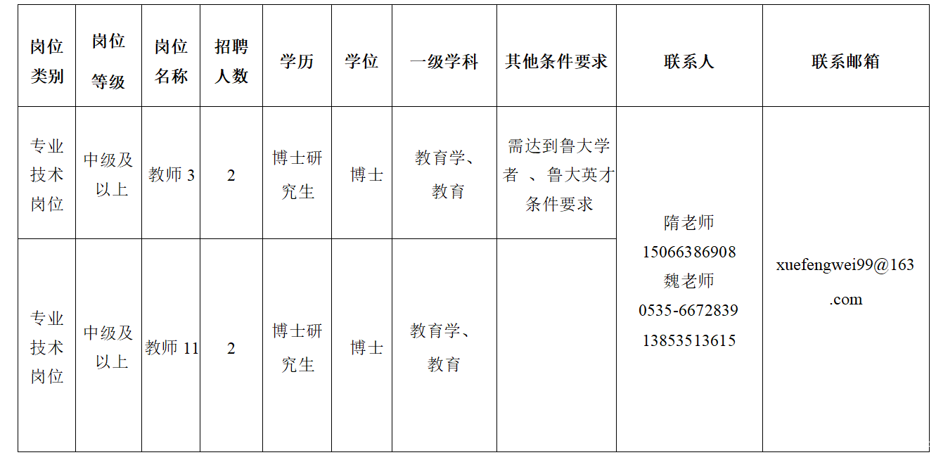 2025年计划招聘高层次人才2人,岗位名称为教师3,优秀博士人才2人,岗位名称为教师11。具体招聘专业、人数和需求如下: