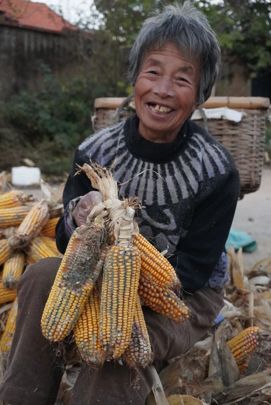 刚晒透的玉米携着土壤,奶奶攥着这捧黄澄澄的收成,笑纹都喜洋洋的。沾染灰尘的毛衣与充满补丁的棉麻裤都是她朴实无华的体现,身后的竹筐还堆着半筐饱满的果实。镜头里她自豪的炫耀着自家收的粮,笑容也在诉说着幸福。