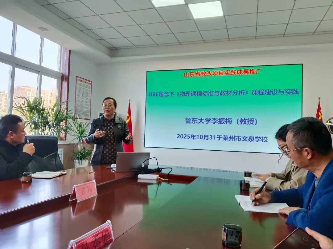 活动中,李振梅教授结合学院在山东省教改项目、在线课程建设等方面的实践成果,深度解读OBE理念,分享超星平台、学院数字化知识创新中心等优质资源,强调跨学科实践需紧扣课程标准、以物理核心素养为支撑的核心原则。针对区域实践中存在的内容零散、特色不足等问题,李教授提出系统性建设、打破思维固化的优化方向,为基层教学提供精准指导。