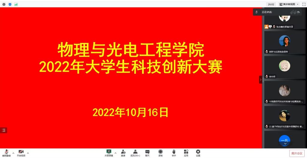 10月16日,我院“2022年大学生科技创新大赛”在线上举办。物理学、光电信息科学与工程、新能源材料与器件本科专业47个项目、共235人参加比赛,全院1000余名本科生观摩学习。