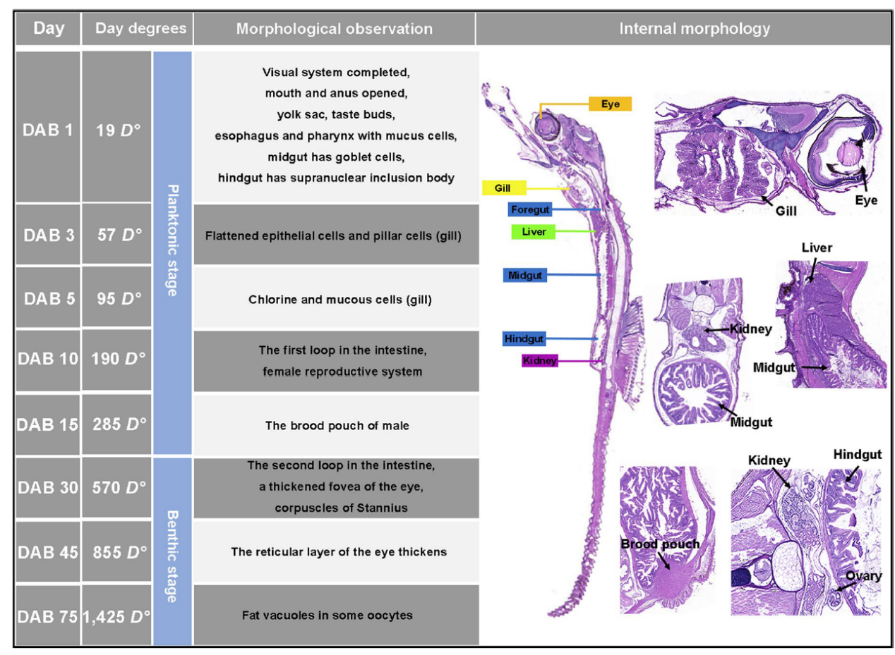 鱼类种质资源开发与利用创新团队近日在《Fish Physiology and Biochemistry》上发表研究,首次对膨腹海马出生后1至75天的器官发生过程进行了系统分析,明确了其发育的三个关键阶段。膨腹海马出生后1-10天为早期浮游阶段,海马出生首日即具备摄食能力;第10天肠道出现首个弯曲结构,推测是为了适应营养增长的需求,并在雌鱼中首次观测到卵巢。出生后10-30天为晚期浮游阶段,海马的呼吸与泌尿系统迅速成熟;第15天雄海马的育儿袋首次出现,奠定后续的繁殖基础。出生后30-75天为底栖阶段,海马肠道形成第二弯曲,基本完成发育;眼部凹陷加深,标志着从浮游生活向底栖生活的过渡。值得注意的是,在整个观察期内,雄性精巢均未被发现,这一现象为后续研究海马性别分化提出了新课题。