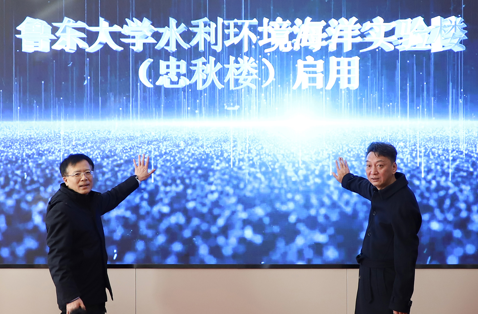2024年12月30日,我校举行水利环境海洋实验楼(忠秋楼)启用仪式。阿里巴巴集团荣誉合伙人王帅先生及其亲属,烟台市自然资源和规划局副局长马超,承建单位代表、山东渤海集团有限公司董事长华金友以及我校领导班子成员出席活动。我校党委书记王庆教授发表讲话。党委常委、副校长岳远彬主持仪式。