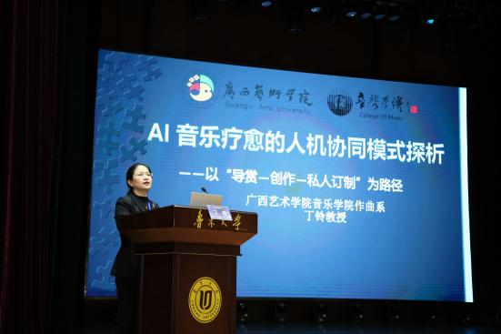 广西艺术学院丁铃教授、马栋梁教授作题为《AI音乐疗愈的人机协同模式探析:以“导赏-创作-私人订制”为路径》的学术报告。